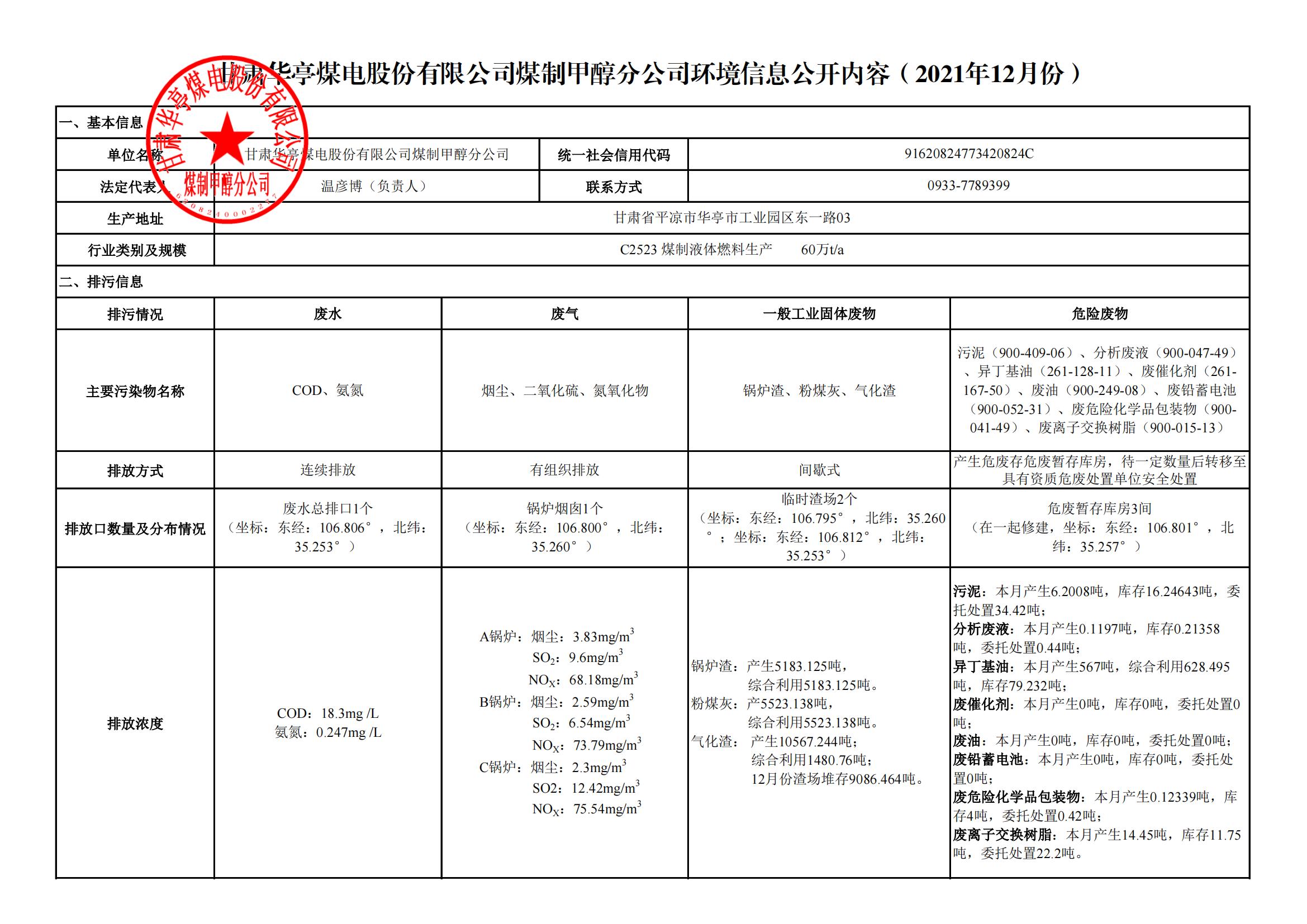 煤制甲醇分公司環(huán)境信息公開內(nèi)容(2021年12月)