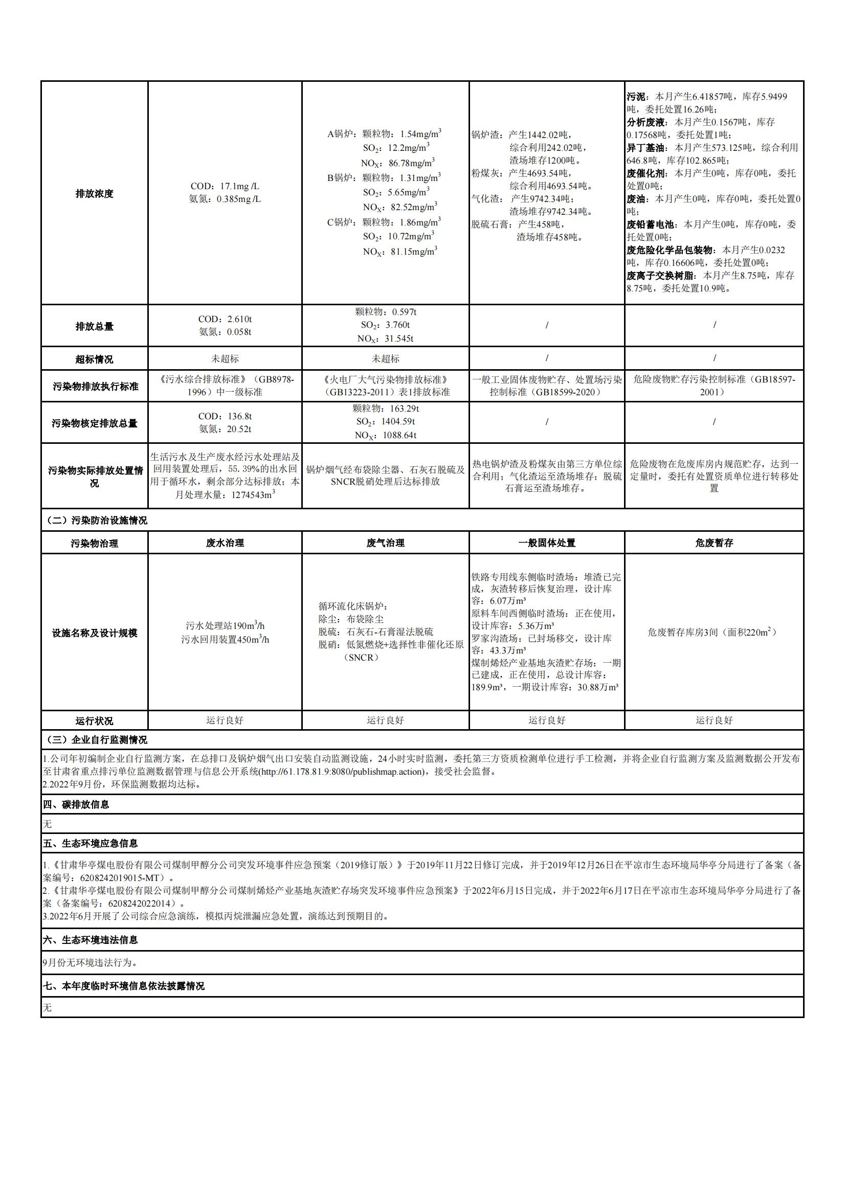 煤制甲醇分公司環(huán)境信息公開內(nèi)容(2022年9月)
